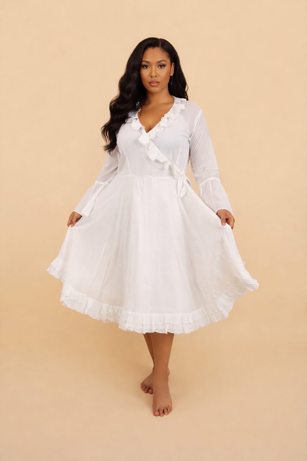 Crafted from sustainably sourced 100% Linen this wonderful wrap dress with adjustable tie, and lace hand embroidery on the bottom and sleeves. 7 metres of fine linen with hand embroiderey on sleeves and hemline. Feminine, timeless design for any occasion.
